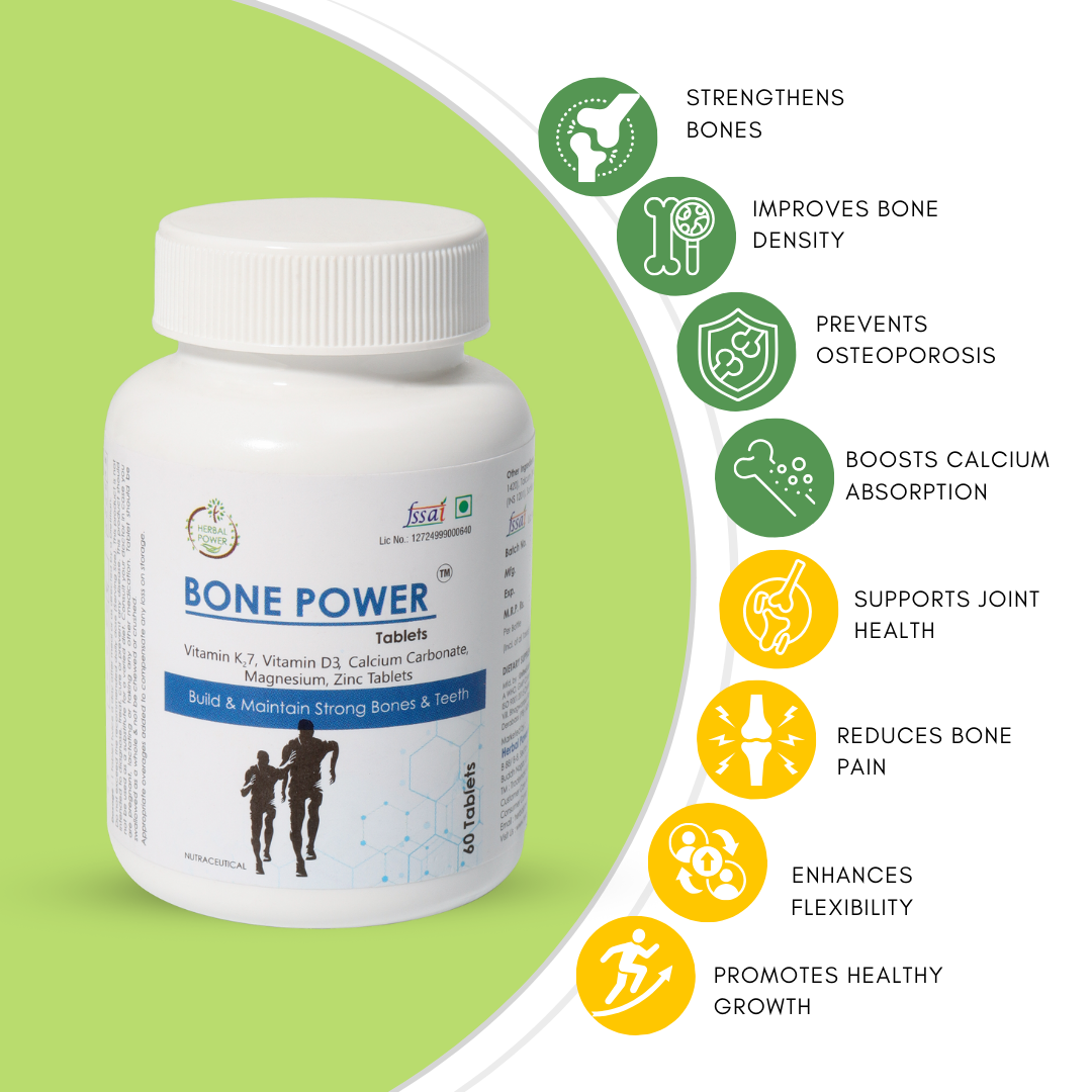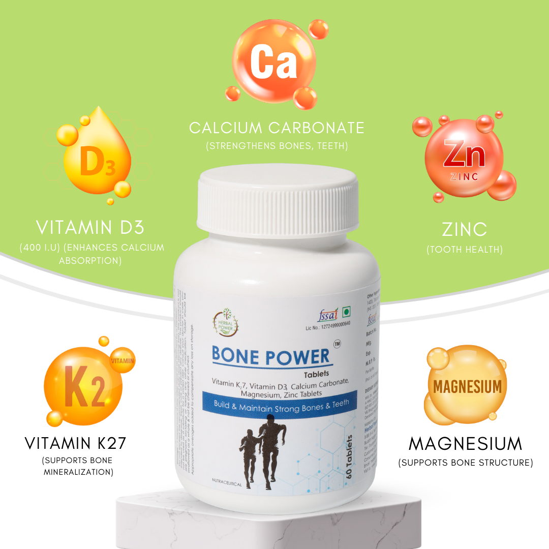 Bone Power is a dietary supplement formulated with a blend of vitamins and minerals commonly used in nutritional products. It includes Calcium, Magnesium, Vitamin D3, Vitamin K2-7, and Zinc, presented in tablet form for convenient daily use. The product is intended for adults looking to include these nutrients as part of their regular dietary routine.