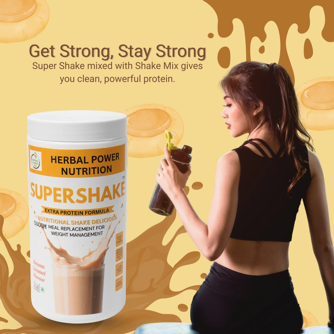 Super Shake banana caramel flavour is a nutritional beverage mix developed to complement everyday diets by providing protein, carbohydrates, dietary fibre, vitamins, and minerals. It is suitable for individuals seeking a convenient way to add nutrition to their daily routine, especially during busy or active schedules.